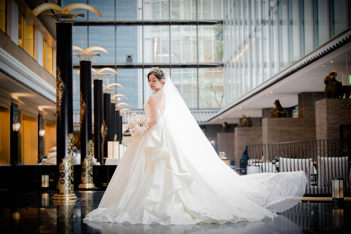 ドレスはシンプルな光沢のあるプリンセスライン